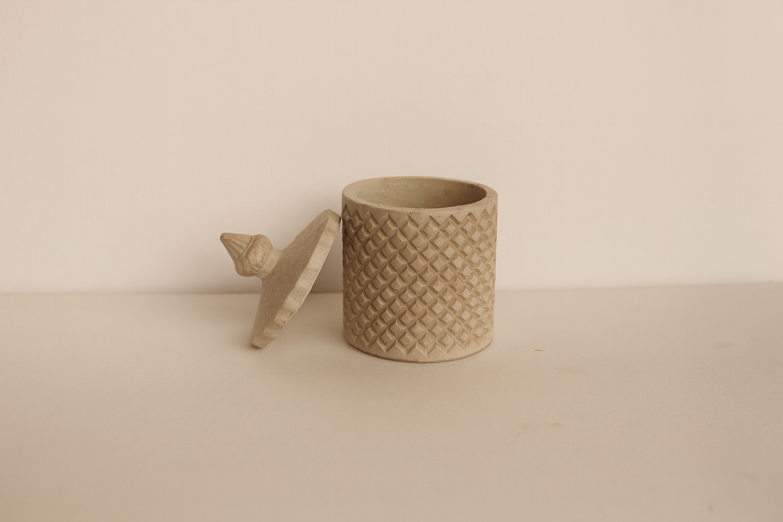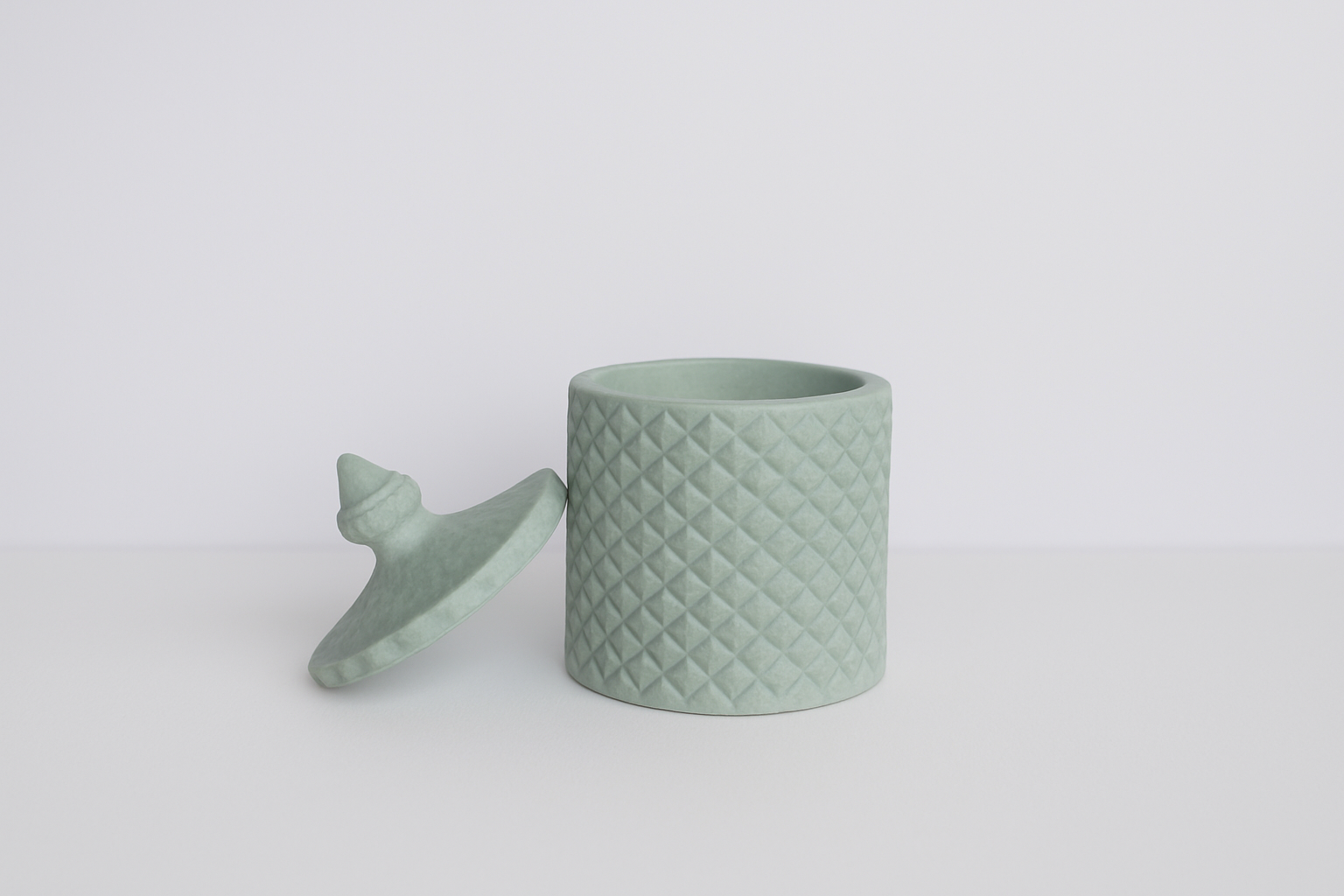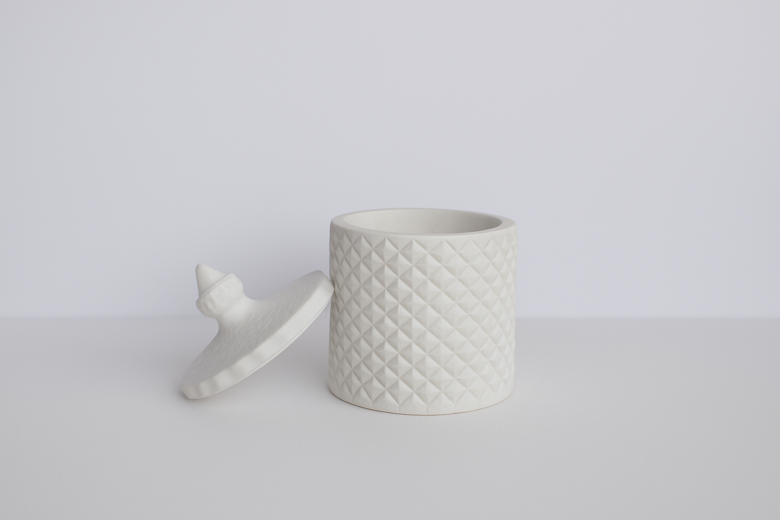 A delicately crafted jar featuring a raised lattice texture and a finely detailed lid with a sculpted finial. Its elegant design makes it perfect for storing small treasures, candies, or simply serving as a decorative accent that blends seamlessly into any setting.
