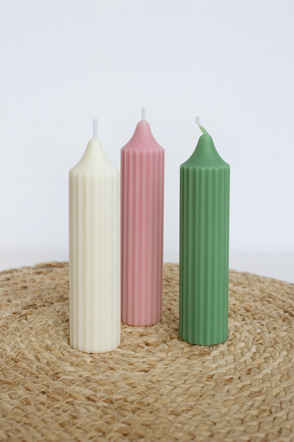 A sleek set of three ribbed taper candles in earthy tones, blending modern elegance with timeless design. Crafted to fill your space with the soothing aroma of coconut, amber and cashmere wood, these candles make a perfect accent for dinner tables, cozy corners, or thoughtful gifting.