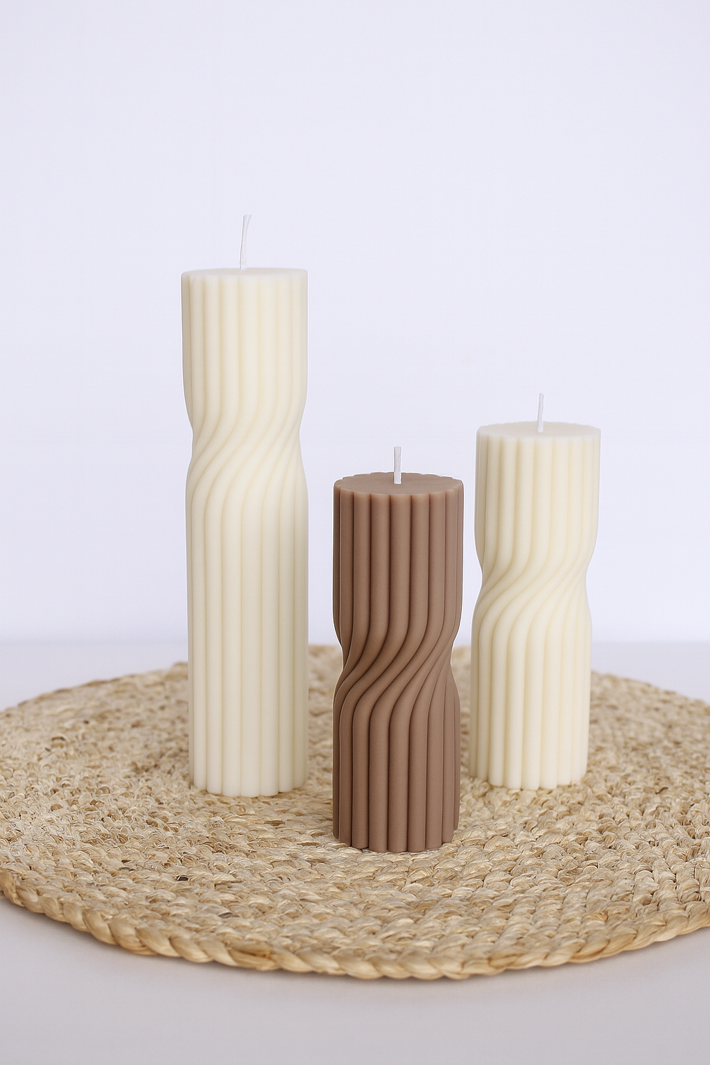 A set of sculptural ribbed candles in elegant twisted shapes, each crafted with soothing fragrances: warm vanilla, tropical coconut, and rich coffee. Perfect for creating a cozy, stylish atmosphere in any space.