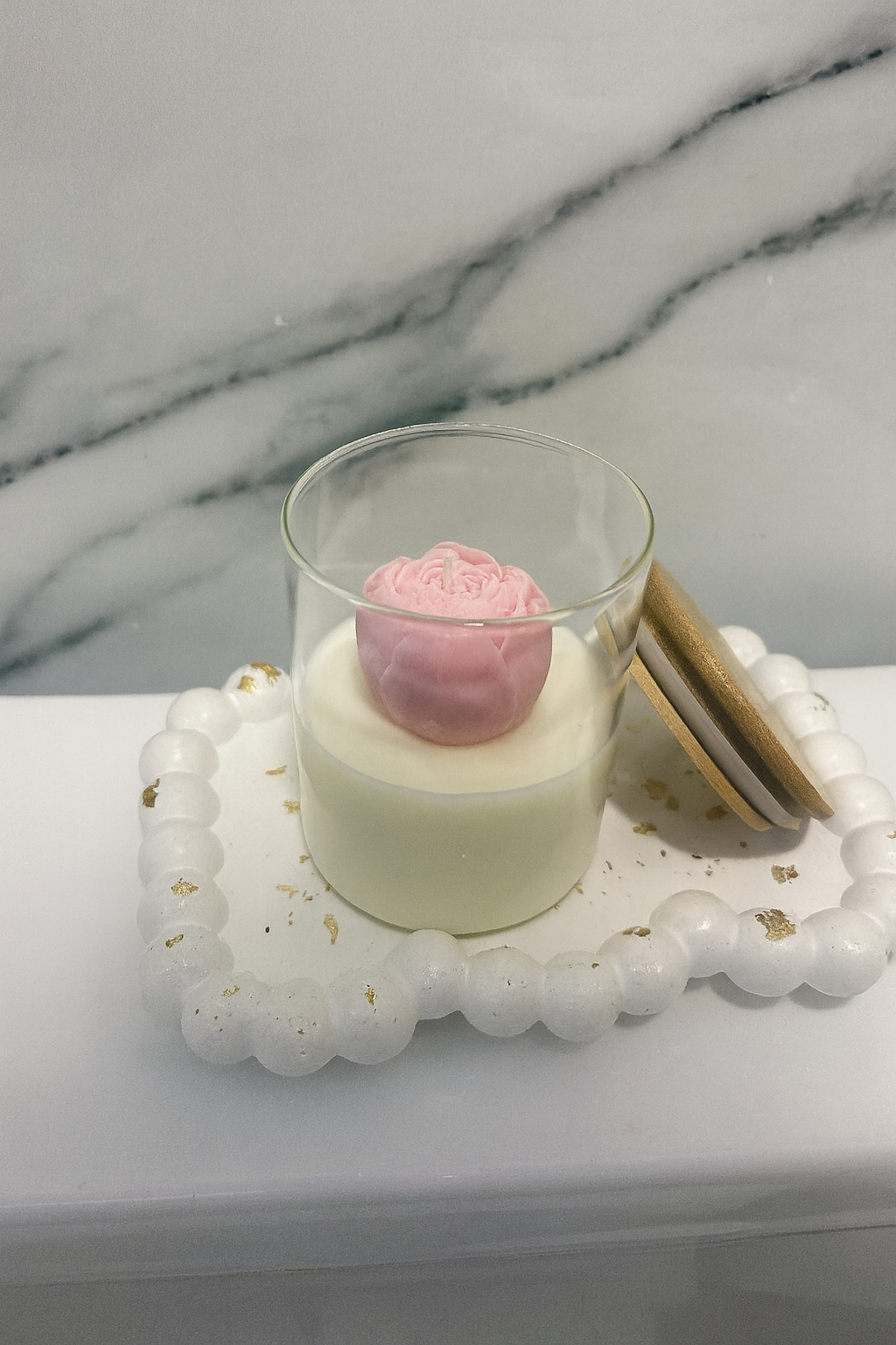 Rose Bloom is a delicate candle crafted to embody romance and grace. A sculpted pink rose rests atop creamy white wax, while the warm fragrance of vanilla and amber fills the air with comfort and allure. Housed in a clear glass with a golden-accented lid, this candle is both a visual and aromatic centerpiece—perfect for quiet evenings, special occasions, or as a heartfelt gift