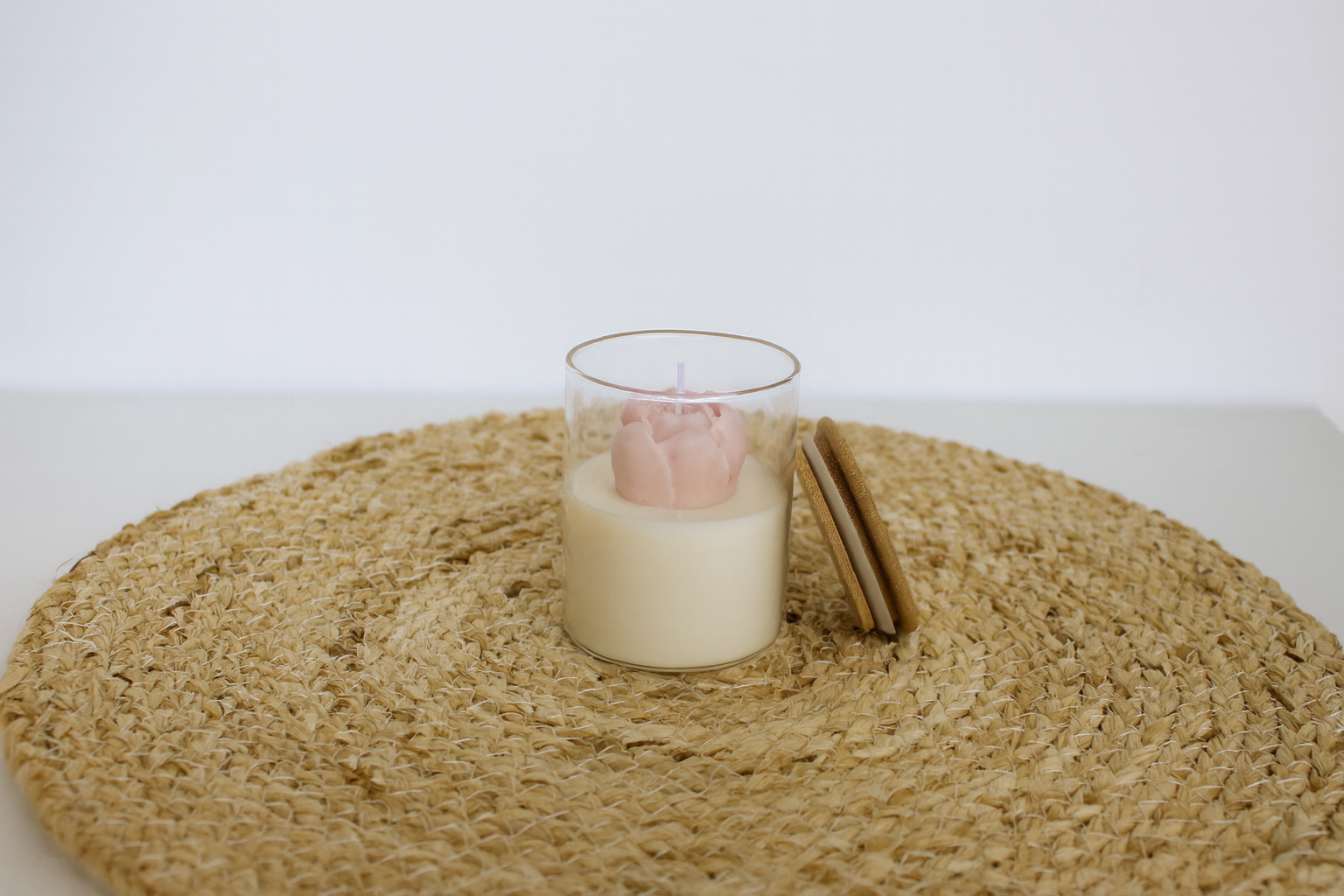 Romantic rose-shaped candle in a clear glass jar with natural wooden lid. A timeless piece that adds elegance to any space. Perfect for décor or gifting.