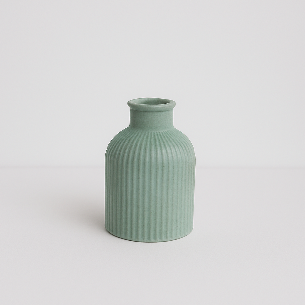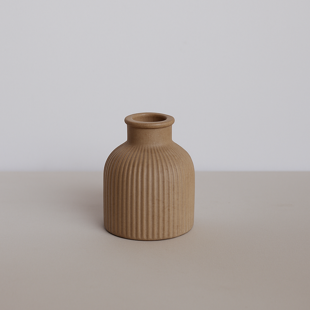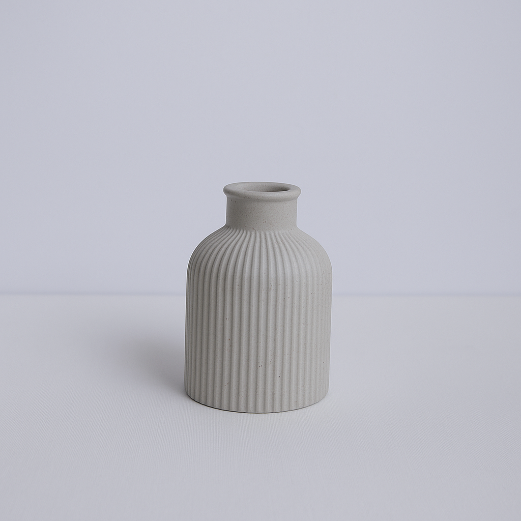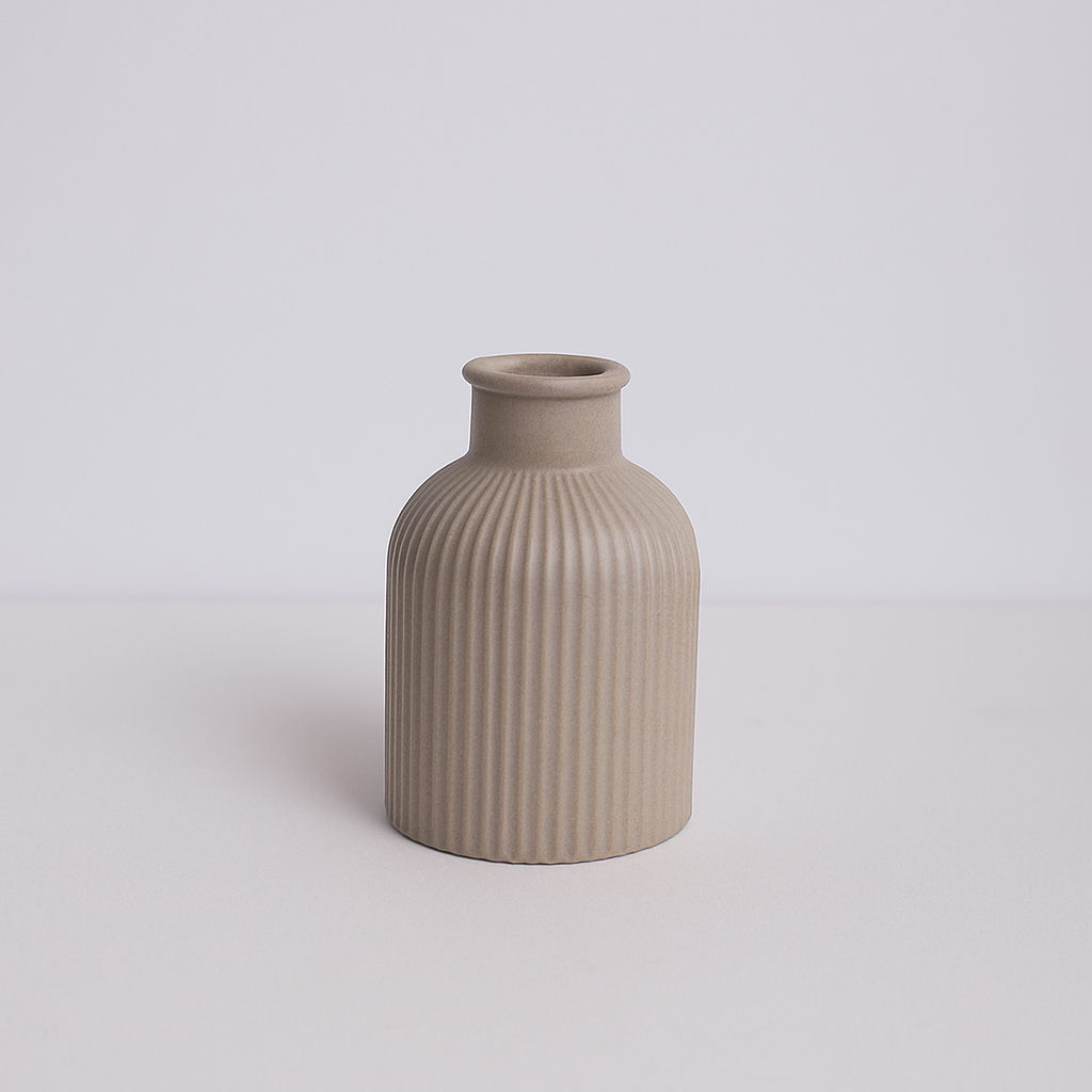 A minimalist vase featuring a smooth ribbed texture and balanced rounded form. Its clean design makes it a versatile accent piece, ideal for displaying dried flowers, simple arrangements, or as a standalone decorative element that adds elegance and character to any space.