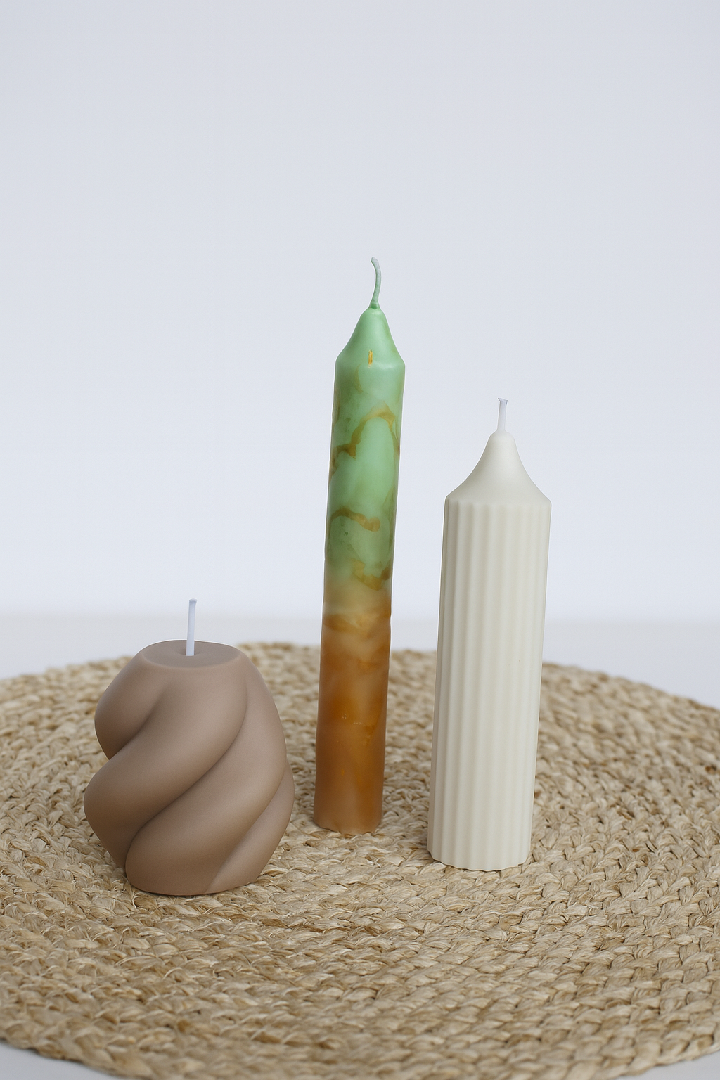 A unique set of three sculptural candles, blending modern design with artisanal detail. Includes a twisted cube, a marbled taper, and a ribbed pillar, each crafted to elevate your space with elegance and the soothing aroma of cinnamon and vanilla. Perfect as a decorative centerpiece or a thoughtful gift.