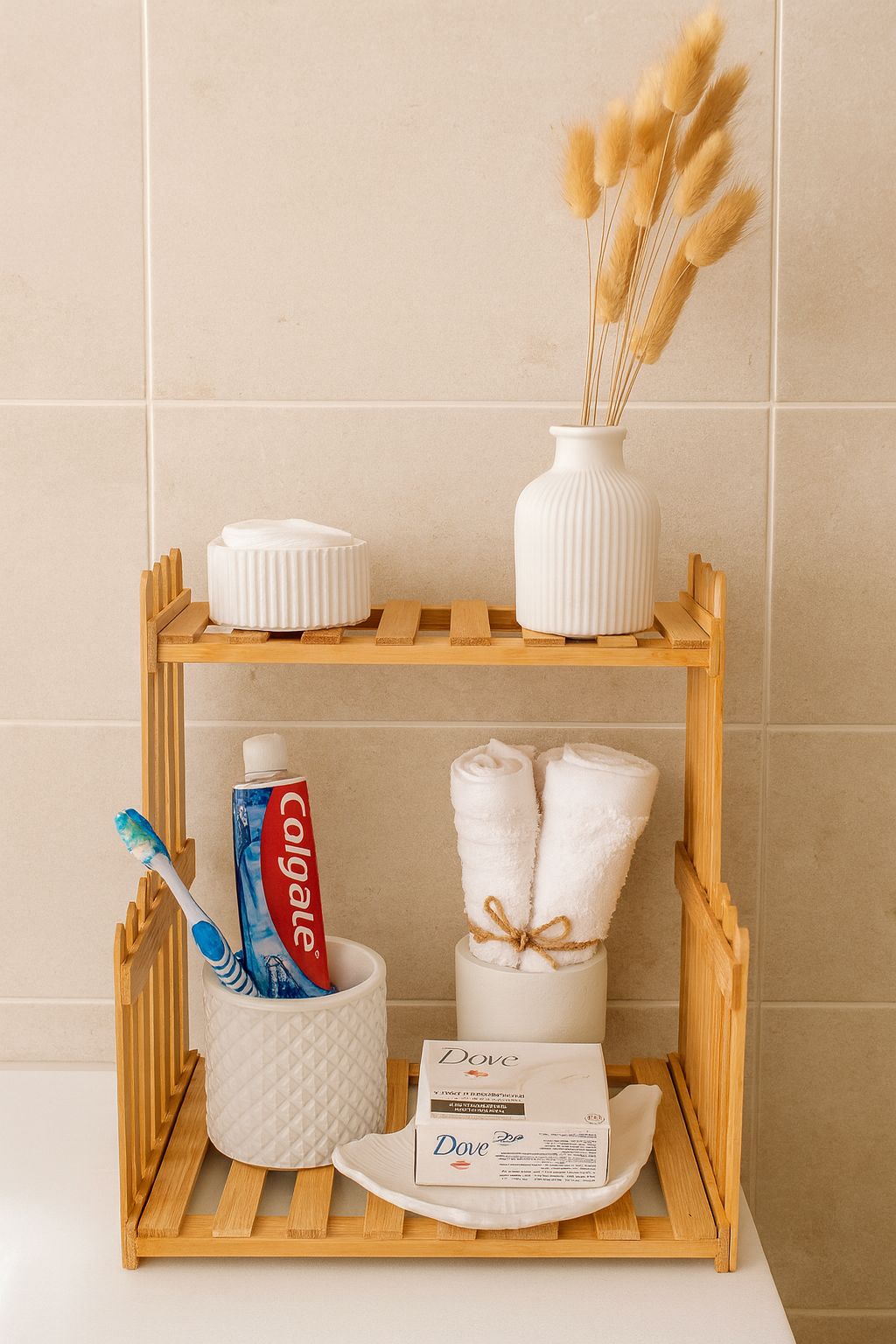 A calming, spa-like bathroom setting that evokes wellness and everyday luxury through simple details. Gentle lighting and warm tones create an ambiance of serenity, while carefully chosen accents transform routine moments into rituals of relaxation. A touch of nature and understated elegance make this arrangement both soothing and timeless. A sanctuary of comfort within your home.