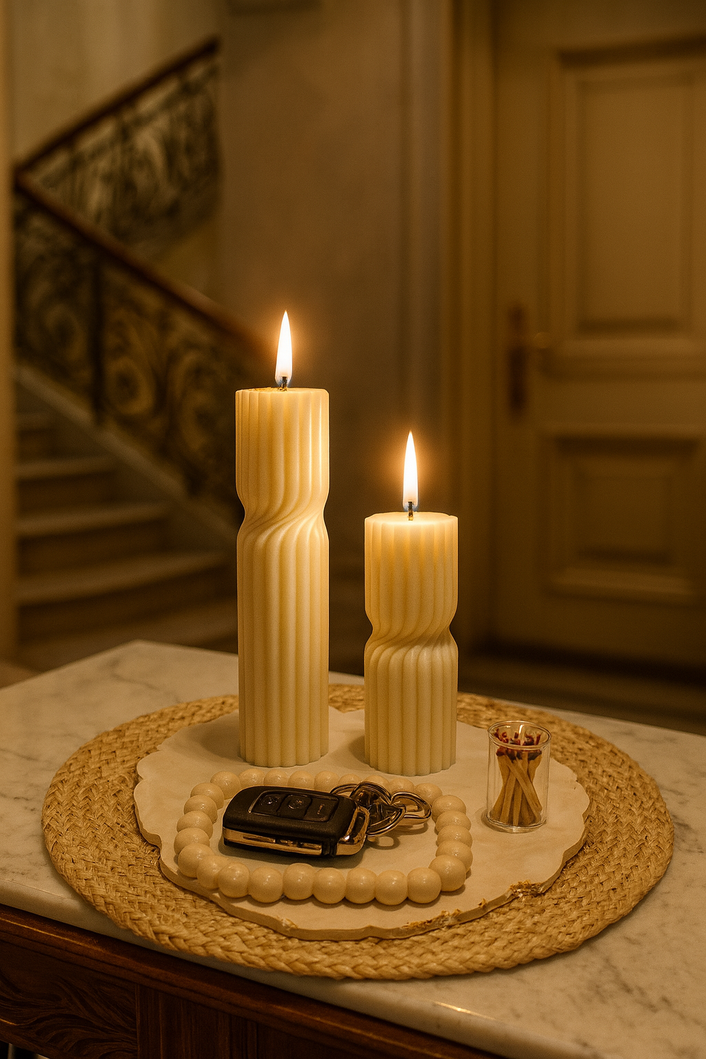 The Grand Welcome — a statement entrance vignette where candlelight meets sculpture and refined luxury, creating an ambiance that symbolizes arrival in style. Infused with the warm, elegant fragrance of amber, it transforms every entrance into a moment of sophistication and allure