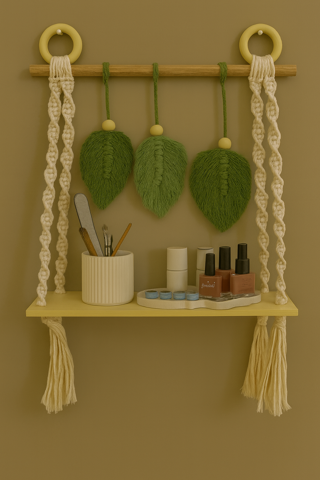 Verdant Haven is a decorative shelf set designed to merge function with natural charm. Accented by handwoven macrame and lush green leaf details, it brings a refreshing touch of nature into your daily rituals. Perfect for organizing self-care essentials, beauty items, or keepsakes, Verdant Haven transforms ordinary storage into an artful display balancing practicality with serene, organic beauty.