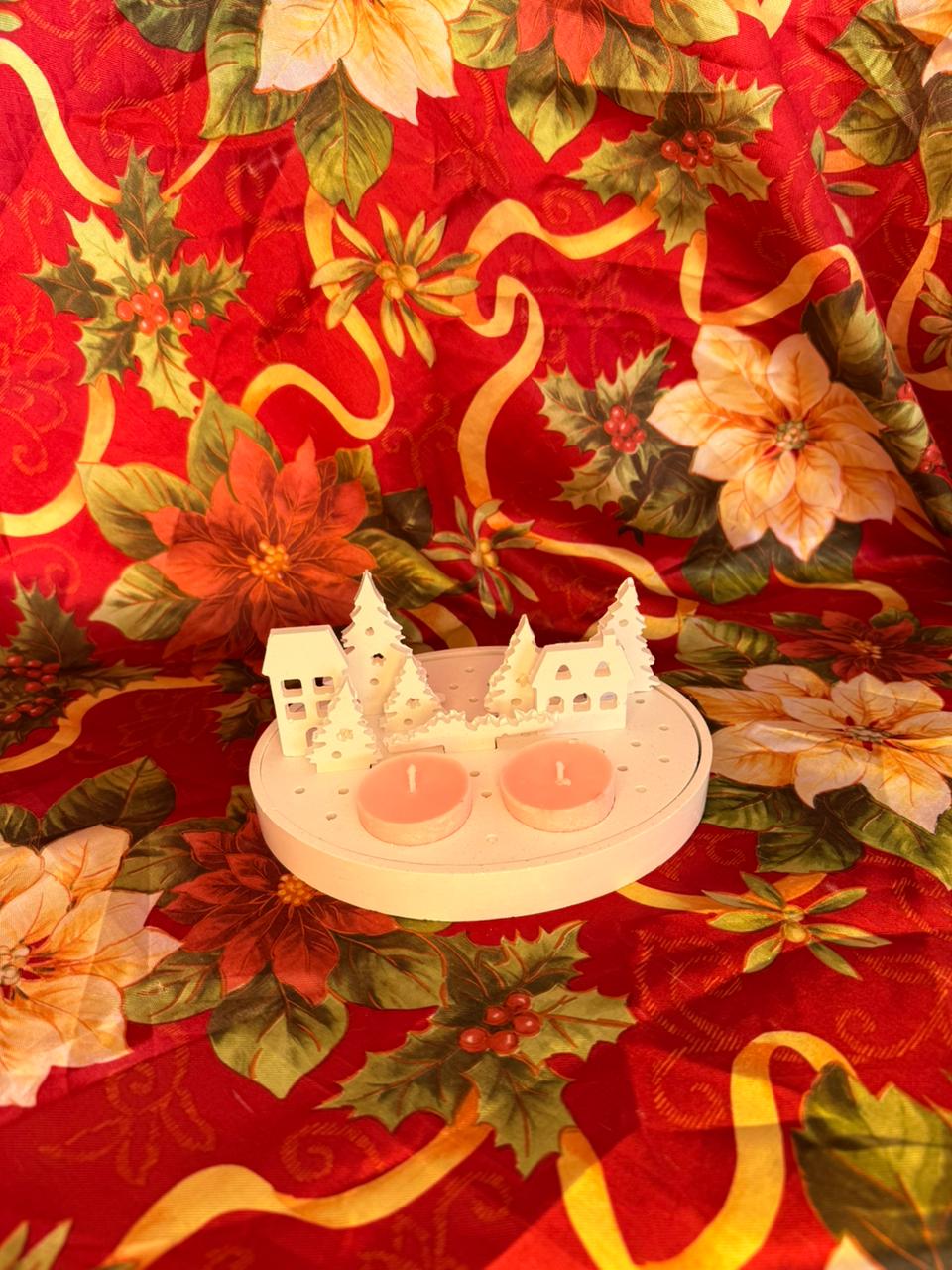 Create a magical holiday ambiance with the Winter Village Candle Display — a handcrafted Christmas scene featuring snowy houses, glittering trees, and two warm glowing candle lights. This enchanting mini village brings the cozy spirit of Christmas right into your home